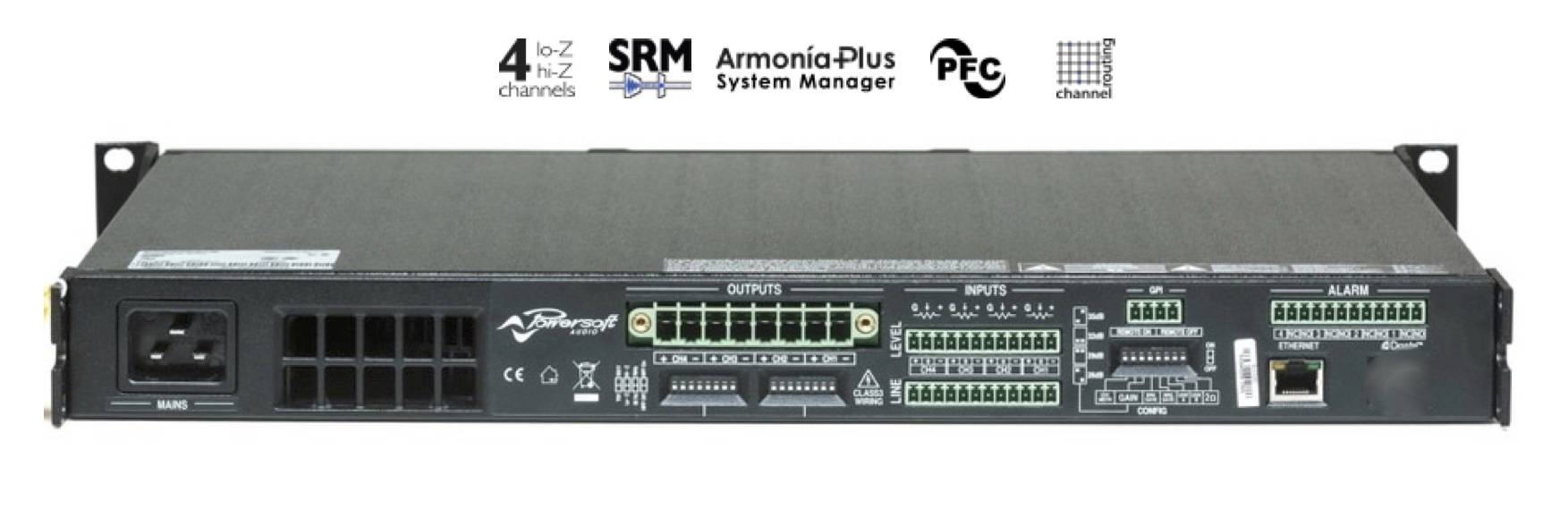 Quattrocanali est conçu pour fonctionner avec des lignes distribuées lo-Z (à partir de 2 Ω) et 70V / 100V, ou n’importe quel mélange des deux. On peut également faire confiance à cette plate-forme d'amplificateur dans des applications critiques, telles que les systèmes d'alarme incendie, grâce à une alimentation sophistiquée qui permet un fonctionnement fiable même en cas de connexion à un onduleur.