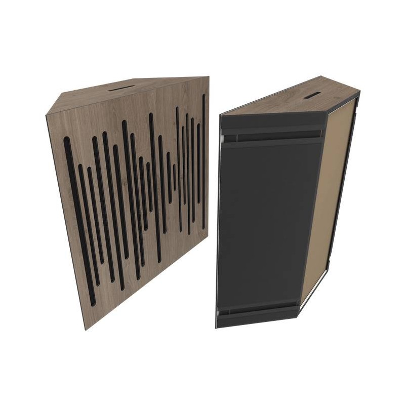 Bass Trap acoustique d'angle absorbant avec côtés biseautés à 45° et face avant en bois.