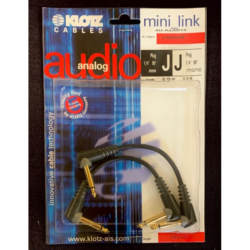 Câble audio analogique asymétrique mono Klotz d'une longueur de 15 centimètres. Connecteurs Jack coudés et plaqués Or.