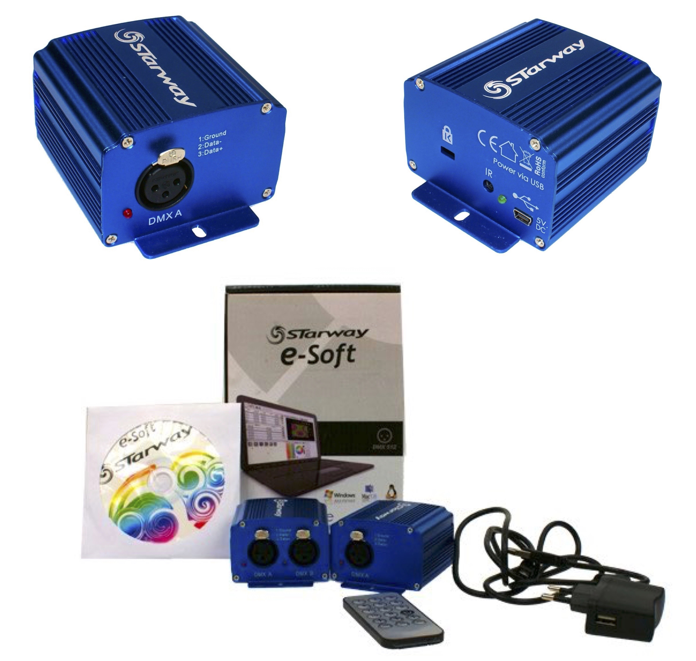 Le Starway E-Box512 est un boitier de gestion DMX dédié au logiciel E-Soft compatibles PC, MAC et Linux avec systèmes 32 et 64Bits et pouvant contrôler plus de 100 appareils simultanément.